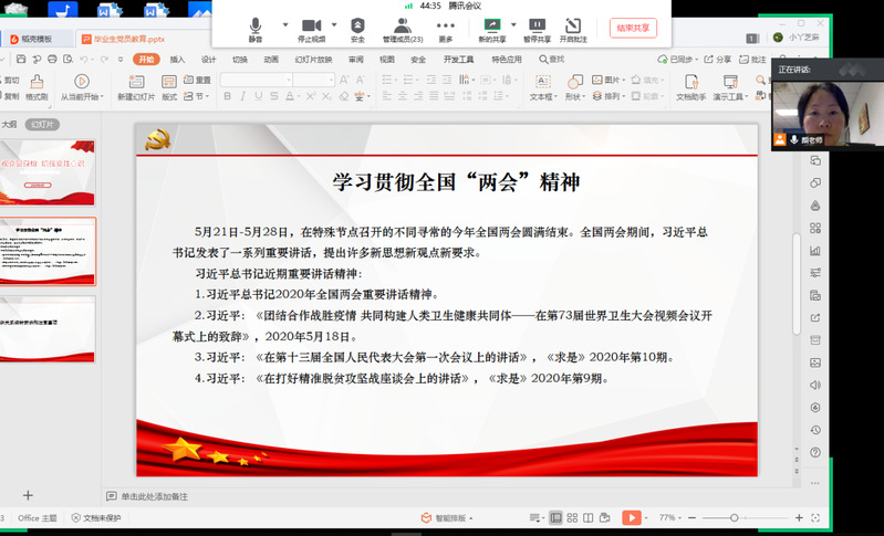 颜娟带领同学们学习了今年“两会”精神,并就毕业生党员组织关系接转的具体要求及注意事项进行了详细解读,解答了同学们提出的问题,引导大家端正态度,加强沟通。
