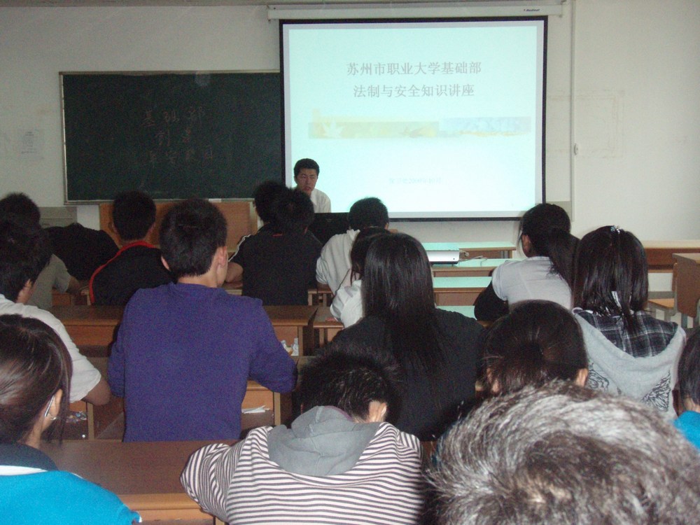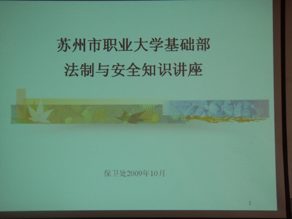 2009年10月28日,基础部邀请保卫处黄达老师在流韵楼208举行了法制与安全知识讲座。讲座由班主任梁辉老师主持,08体育教育和09体育教育两个班的同学参加了讲座。