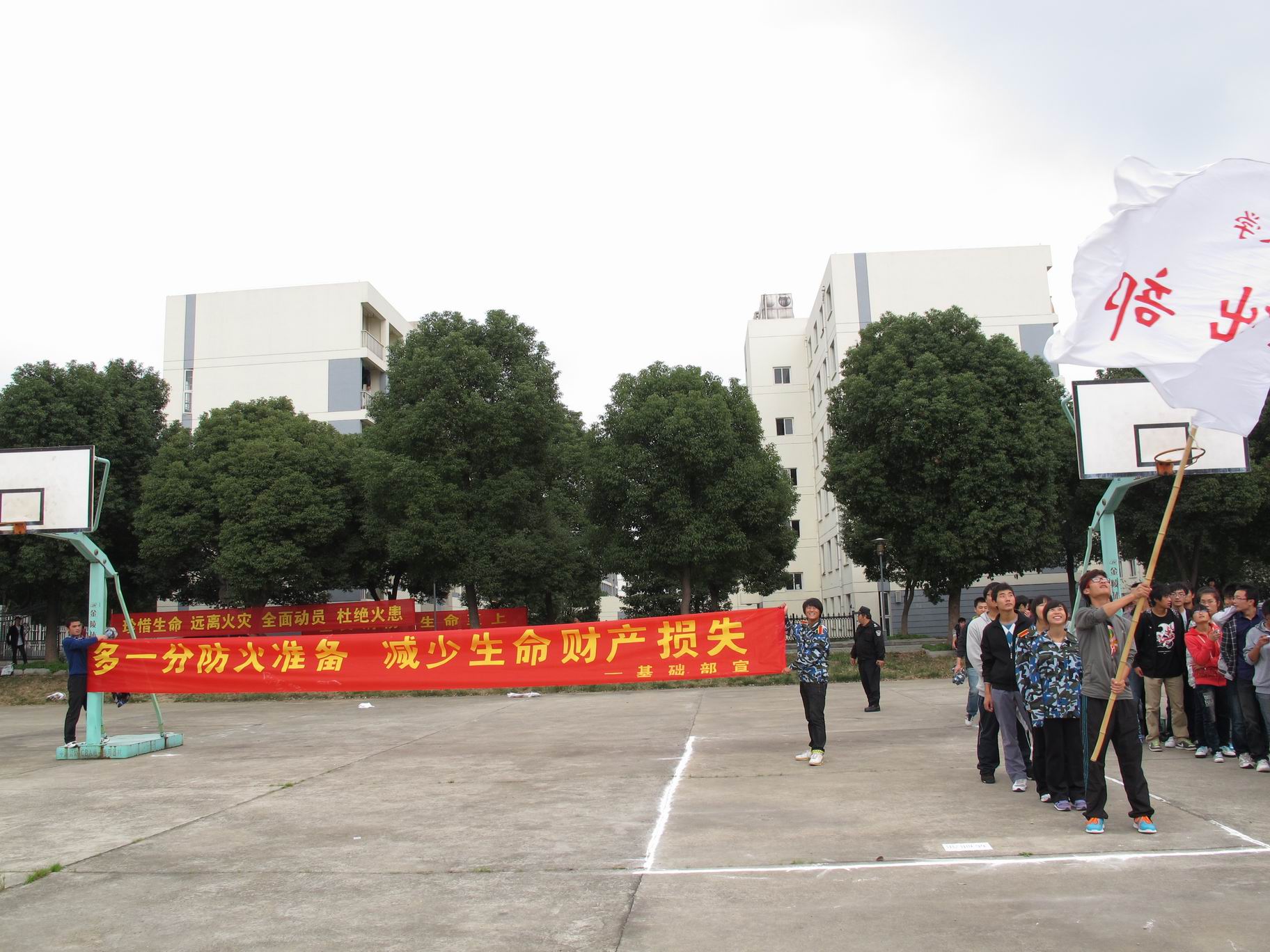 为认真贯彻落实消防安全“四个能力”建设,切实加强消防安全工作,进一步提高师生的消防意识和消防自救能力,2011年11月16日下午13:30,在校文耀街篮球场进行了第九届消防运动会。